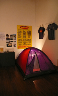 陳德政詭異要睡在這一夜的帳篷在另一旁,那是他在二十歲的那年夏天,唯一一個東方人參加英國V99與Read Festival兩場音樂祭所陪伴的帳棚,裡頭還掛著一個夜間小燈。他把當時旅途上的火車票根,Blur樂團海報、所有紀念小物都展示出來,標題列著─「二十歲的搖滾夢」。牆壁上留著他的文字,他的青春也從此留住了。